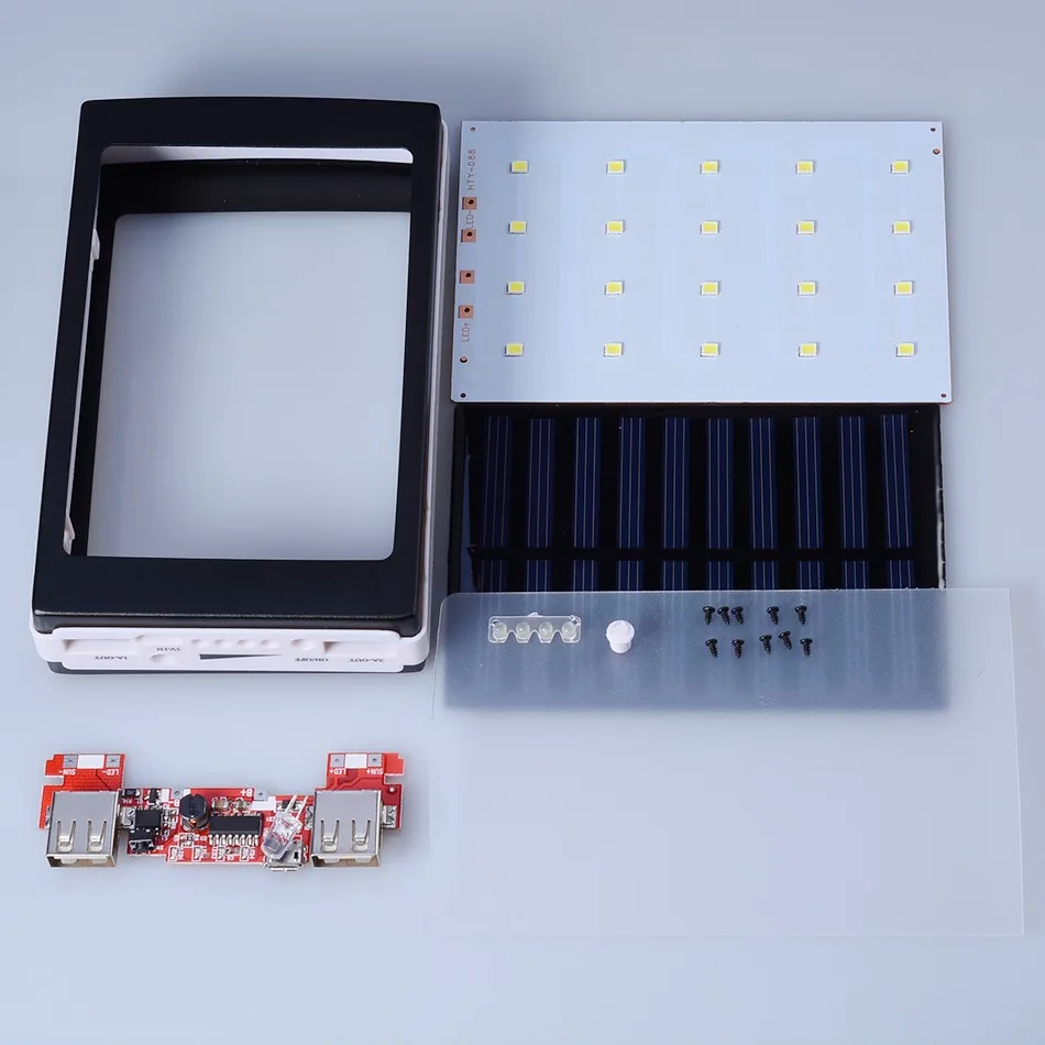 Main Features : Universal 5V PCBA Motherboard Solar Power Bank Case DIY Box Dual USB 20Pcs LED 5x18650 Solar Powerbank DIY KIT(No Battery)