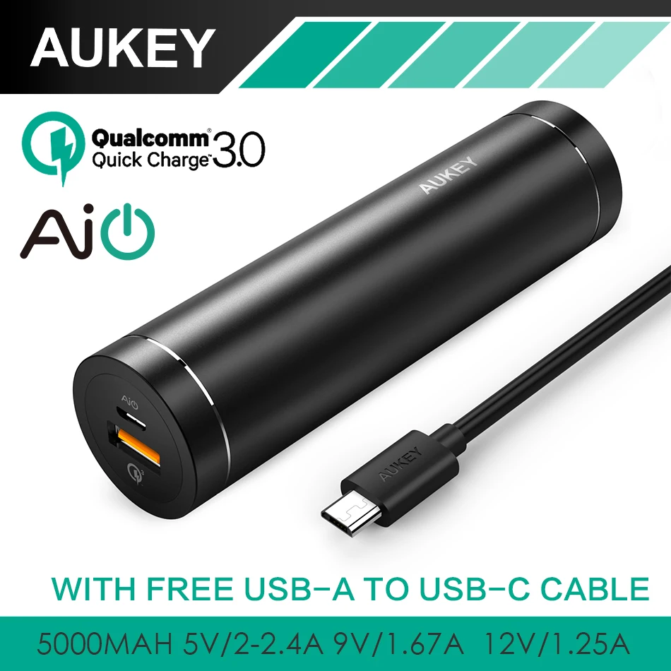 Main Features : AUKEY Quick Charge 3.0 5000mAh Mini Cylindrical Power Bank With AiPower Adaptive Charging Portable External Battery for Samsung